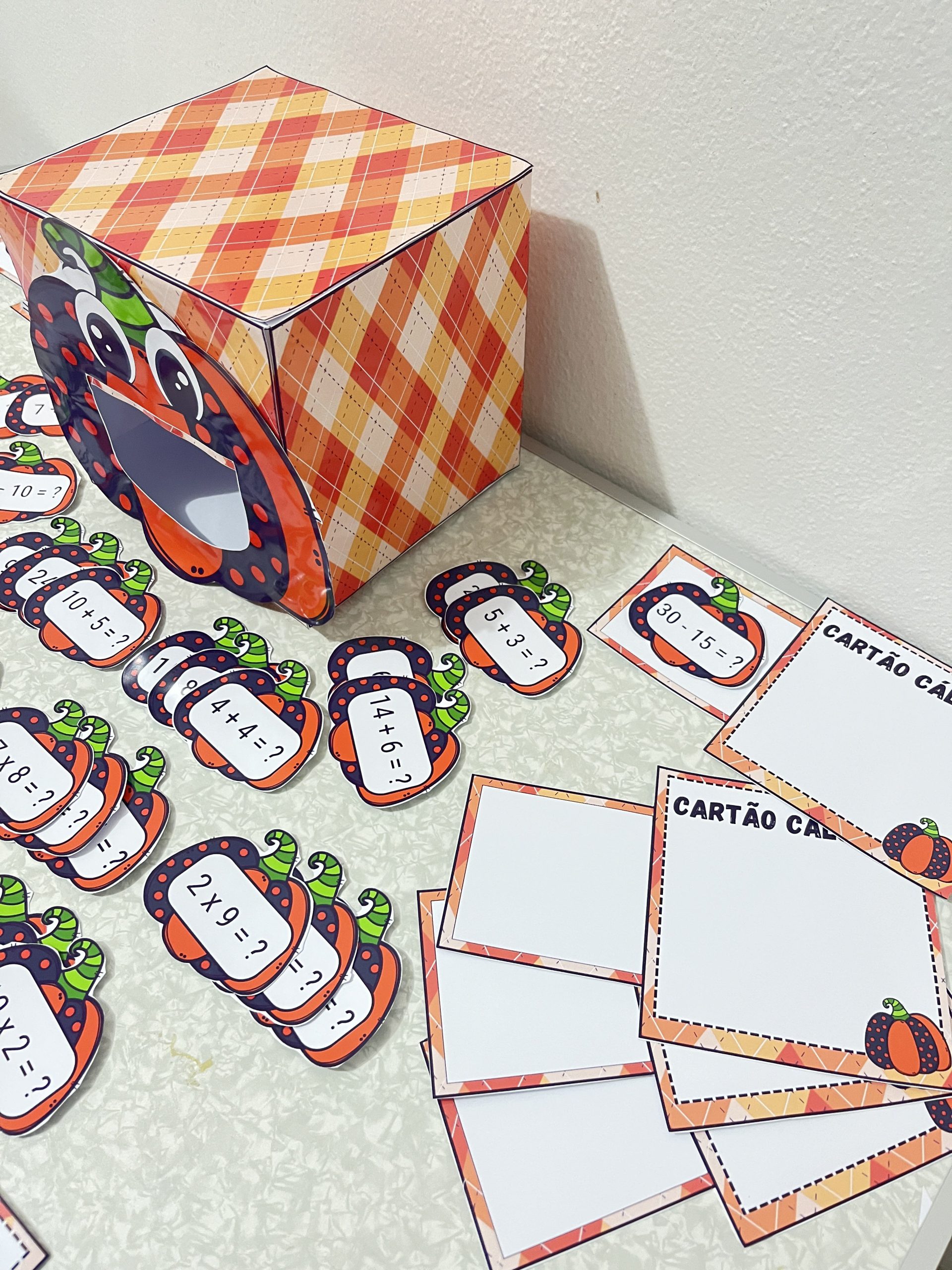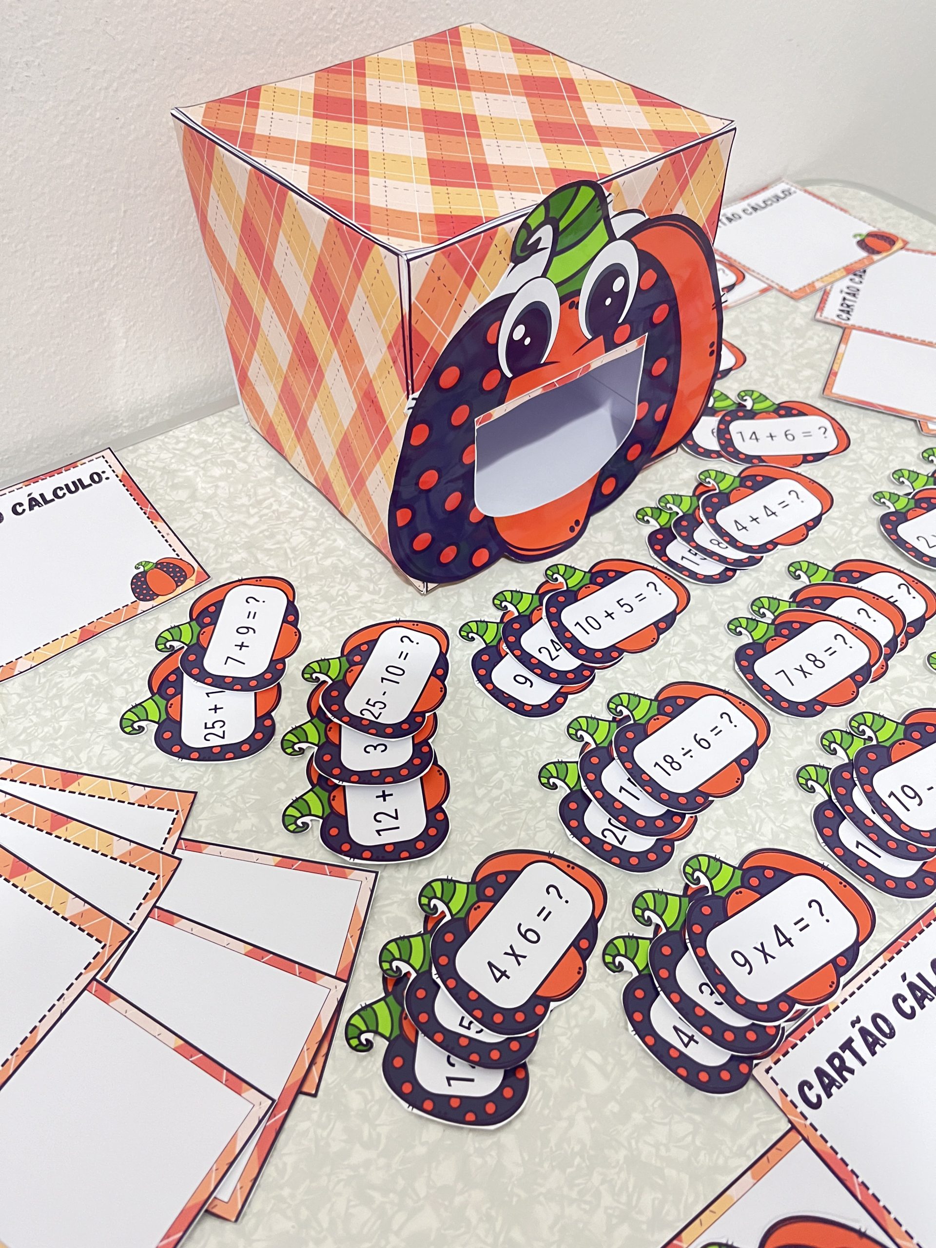 🎃 abra a caixa e retire um card, a criança deve utilizar o cartão cálculo para fazer as operações matemáticas e logo após podem compartilhar o resultado com os colegas.