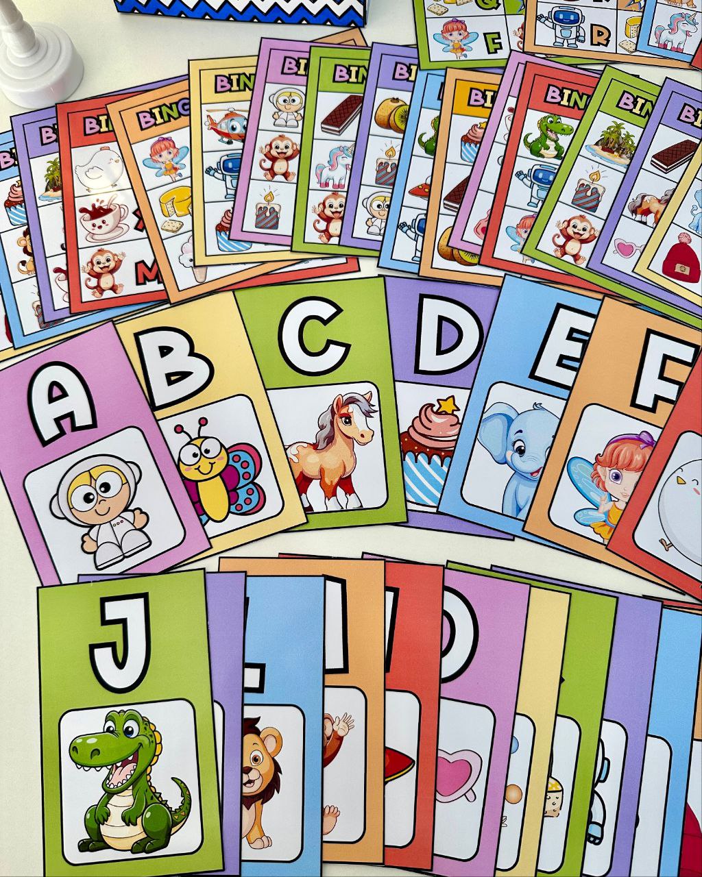 Bingo do Alfabeto com 24 cartelas diferentes e fichas ilustradas de todas as letras para sorteio.