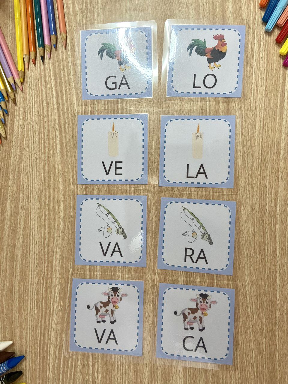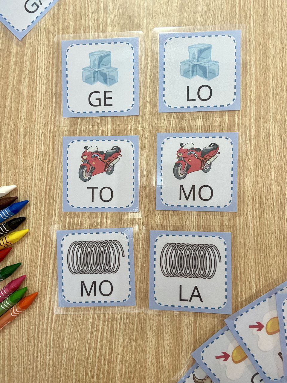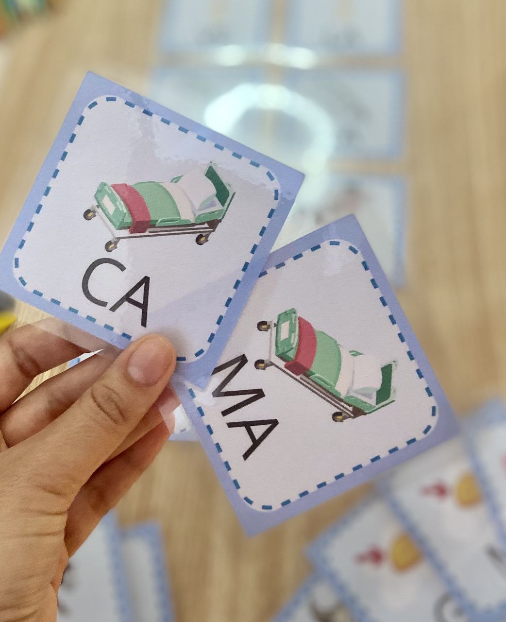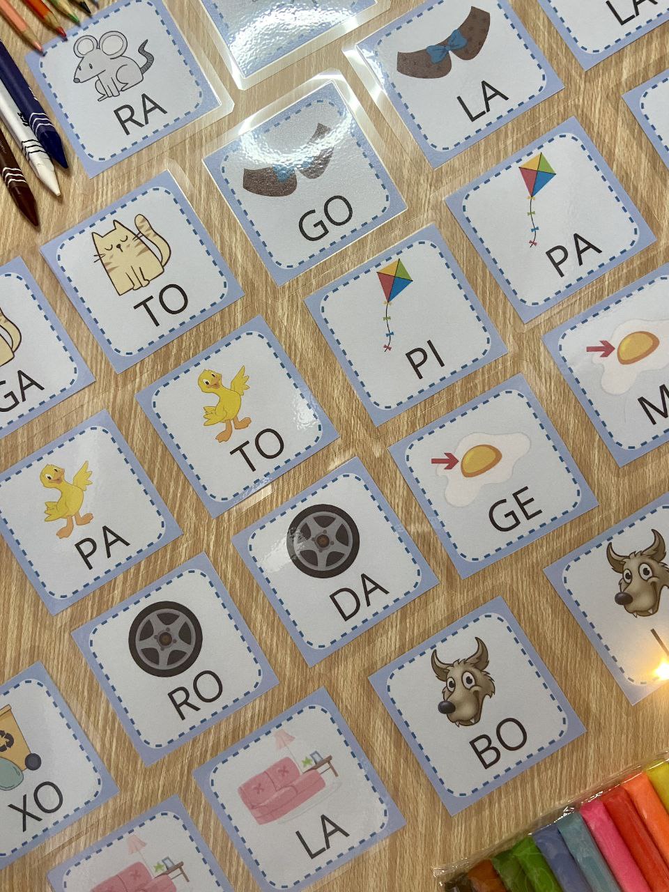 As fichas são divididas em sílabas, excelente forma de estimular a criança através de jogos em grupo ou trabalhando de forma individual com a criança.
