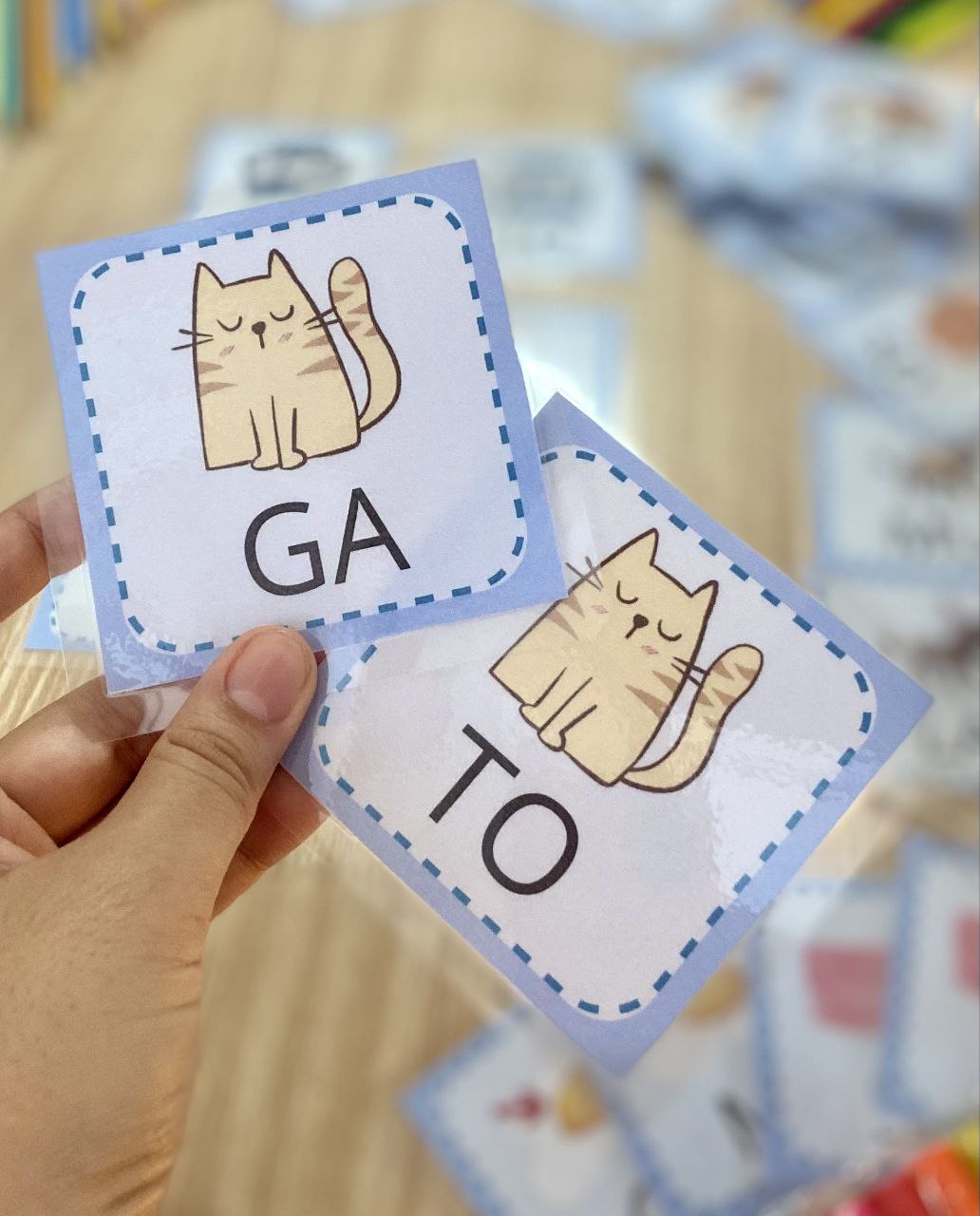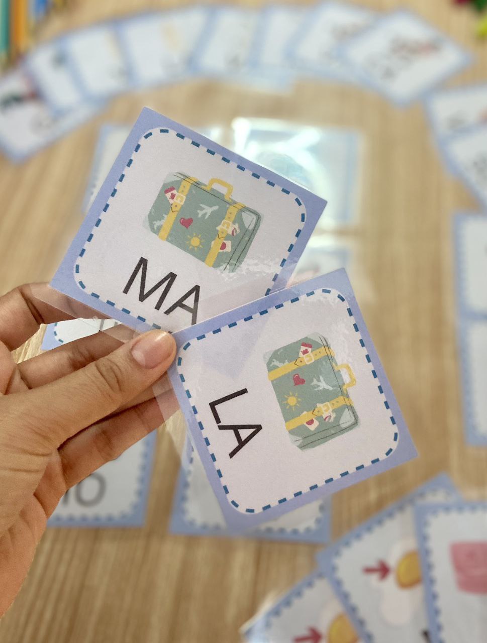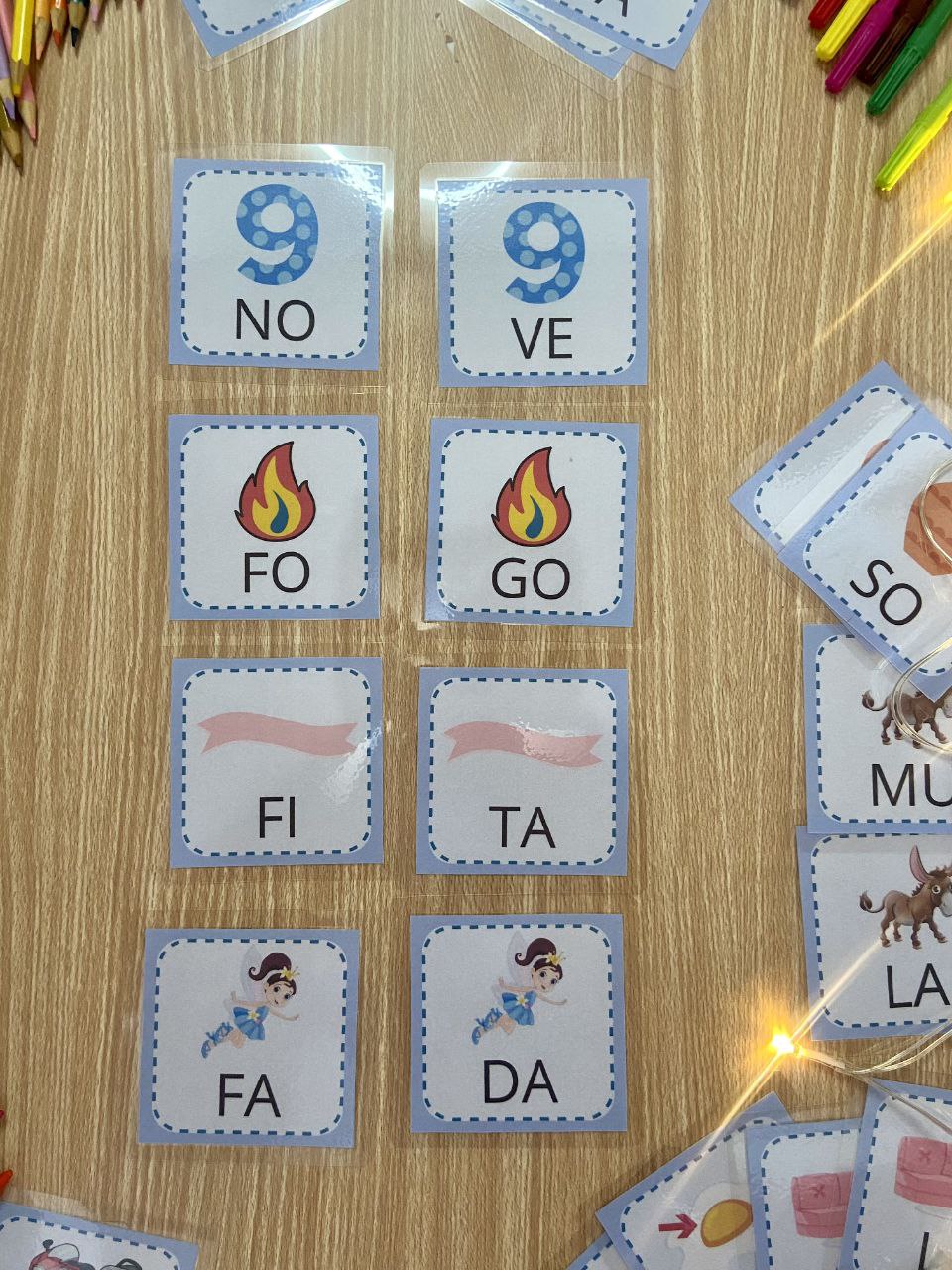 As fichas são divididas em sílabas, excelente forma de estimular a criança através de jogos em grupo ou trabalhando de forma individual com a criança.
