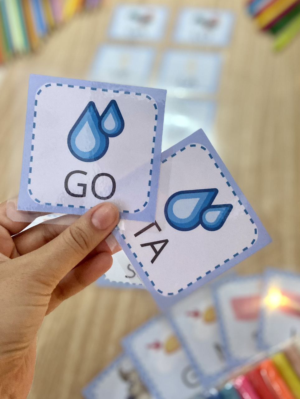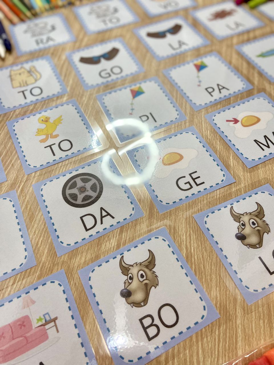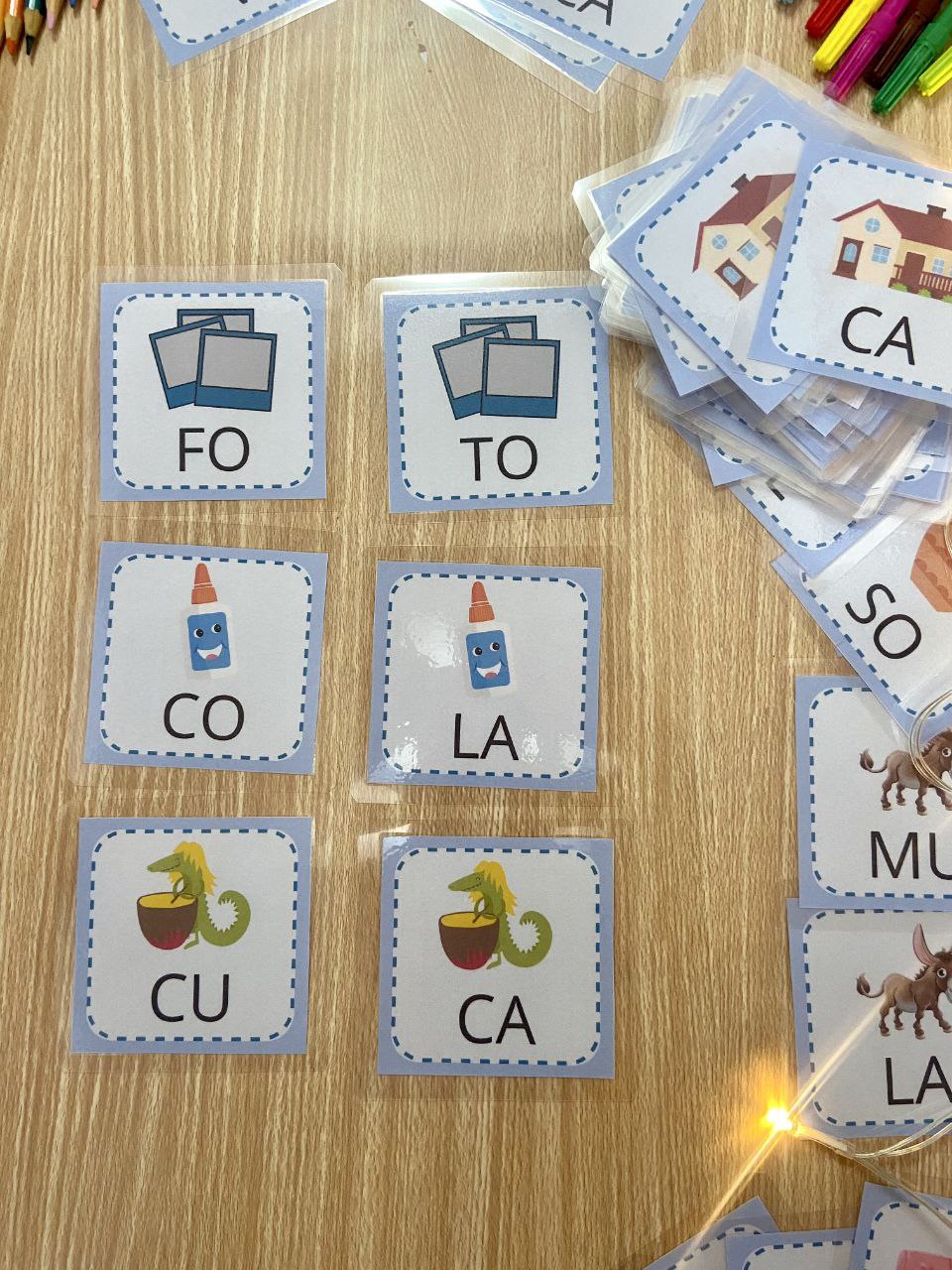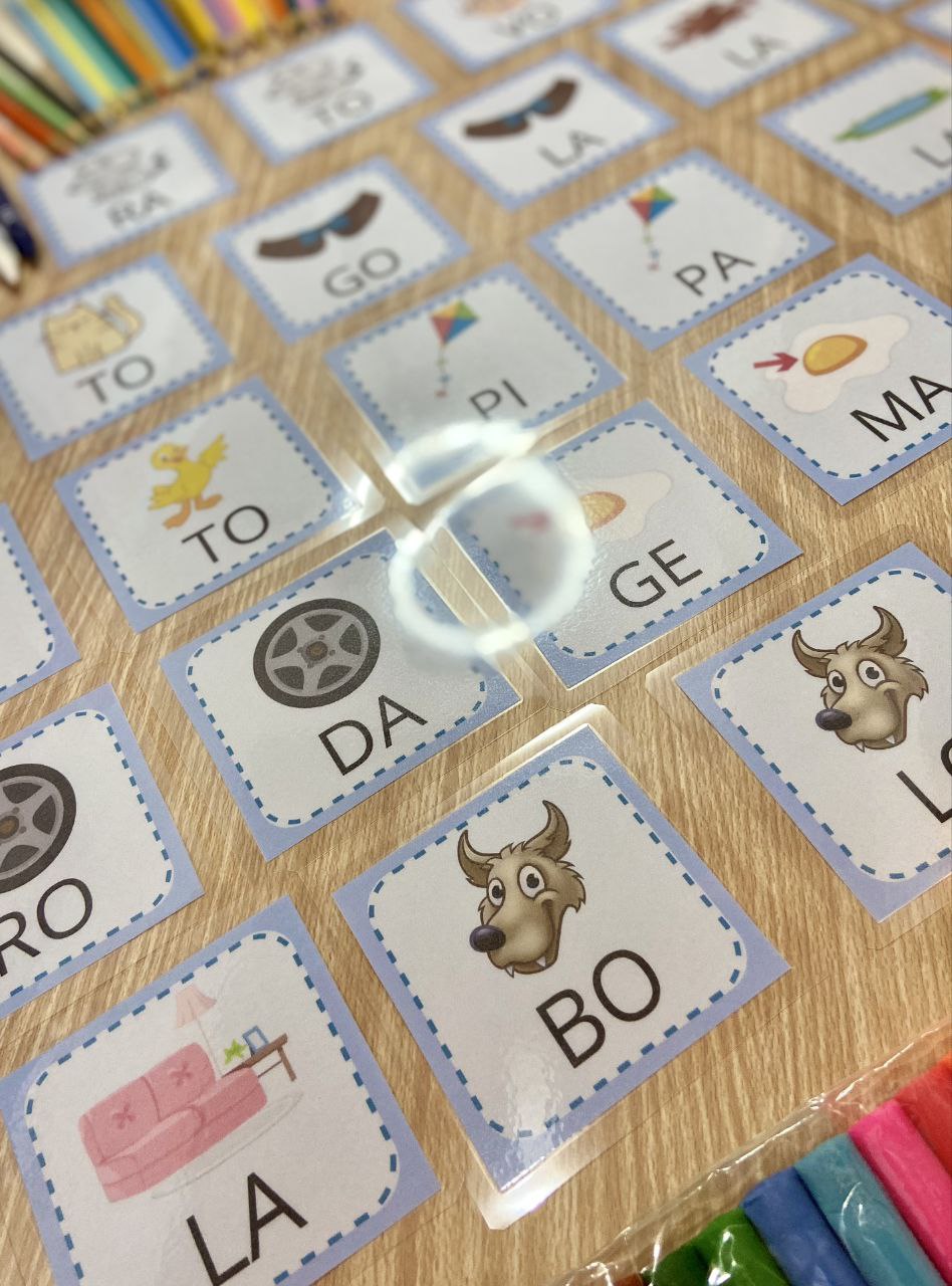 As fichas são divididas em sílabas, excelente forma de estimular a criança através de jogos em grupo ou trabalhando de forma individual com a criança.