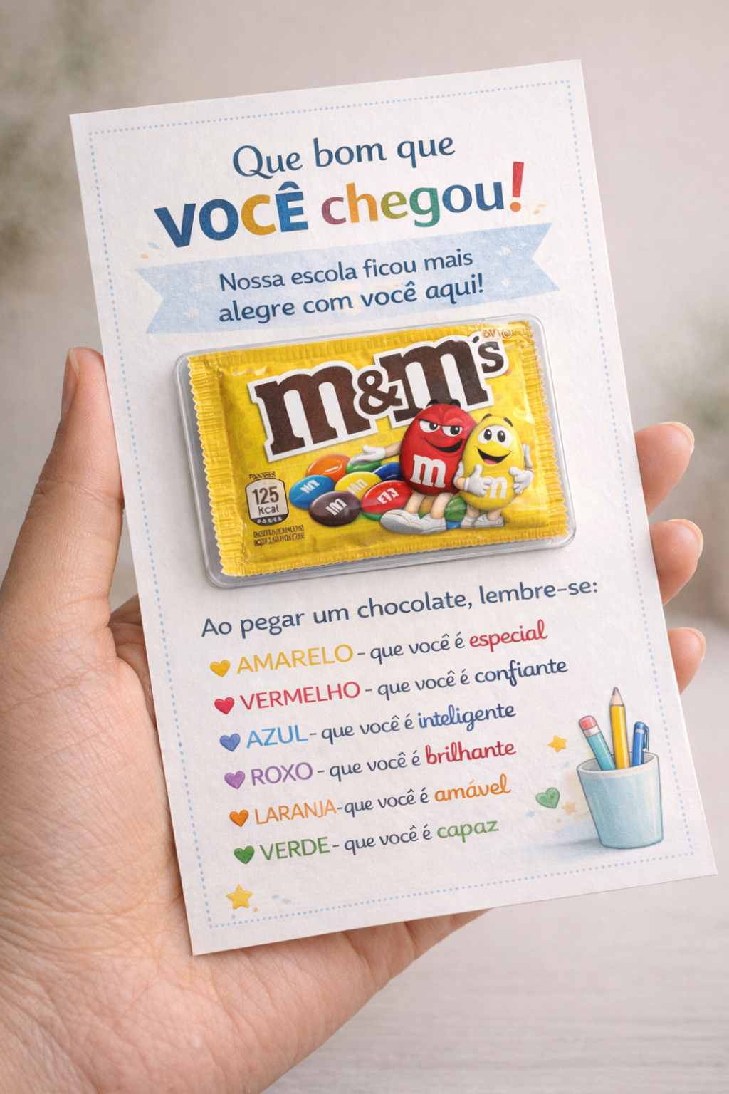 💡 O cartão vem com um espaço em branco central, pensado especialmente para a professora colar o chocolate de sua preferência (M&M’s ou similar), tornando o momento ainda mais especial e personalizado.