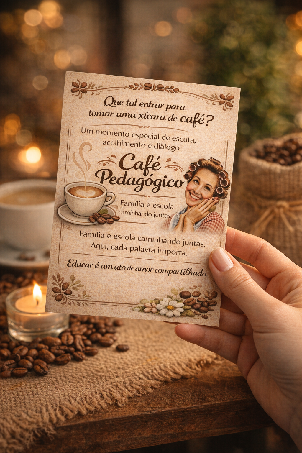 Um cartão delicado, acolhedor e cheio de significado, ideal para tornar o Café Pedagógico um momento ainda mais especial. Perfeito para fortalecer os laços entre família e escola, promovendo diálogo, escuta e acolhimento.