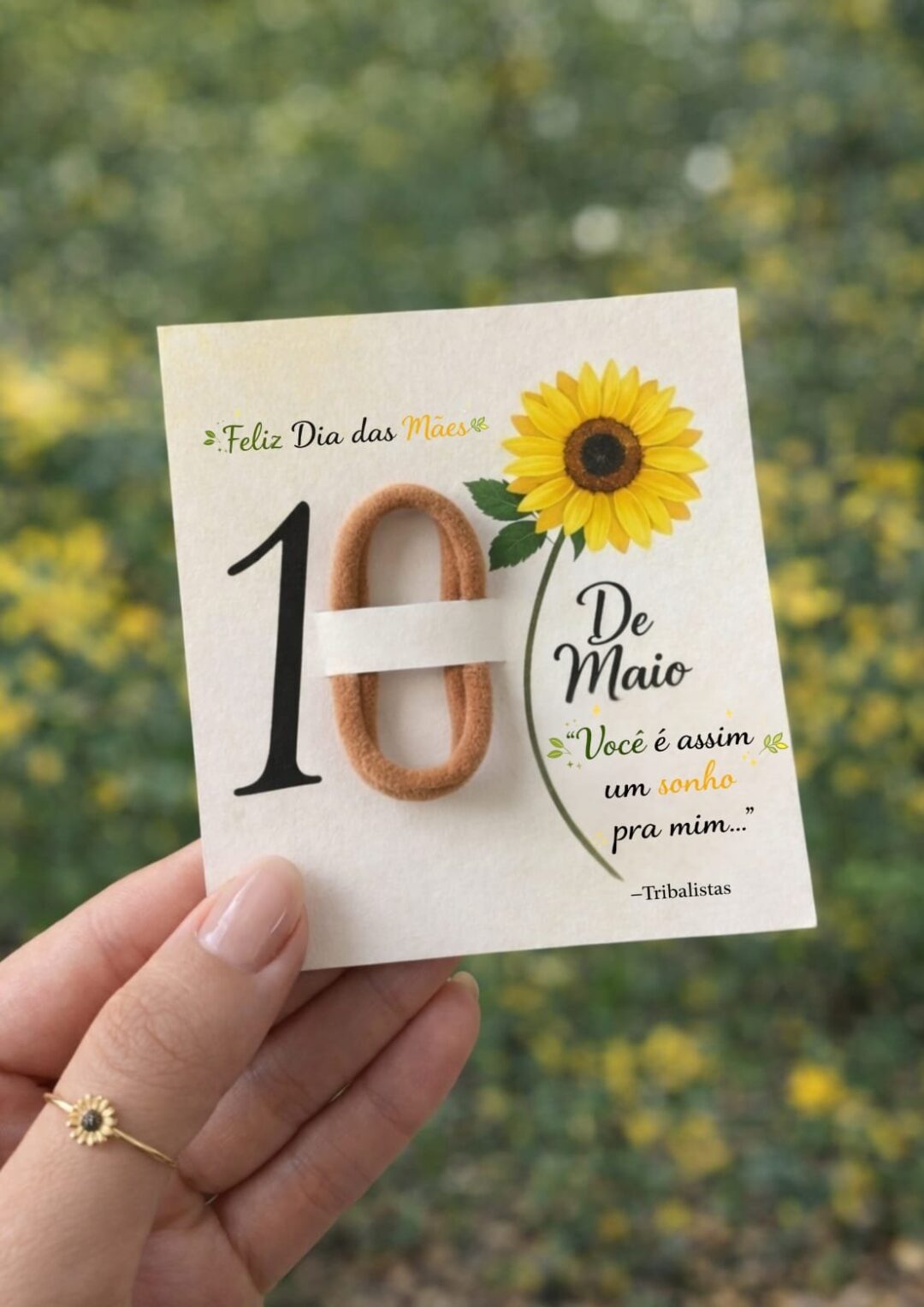 Este cartão foi desenvolvido com um design elegante e afetivo, trazendo a proposta de anexar uma xuxinha de cabelo, formando o número 0 e completando a data 10 de Maio – uma ideia criativa e encantadora para presentear.