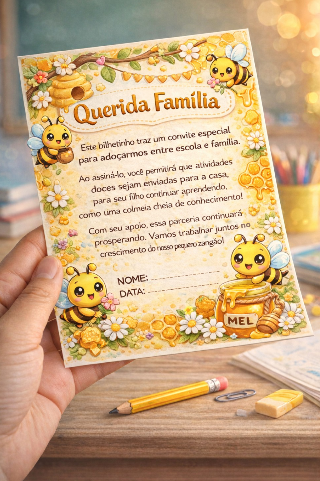 Encante as famílias com este lindo cartão temático de abelhinhas, criado especialmente para fortalecer a parceria entre escola e família. Com uma mensagem carinhosa e significativa, o cartão convida os responsáveis a participarem ativamente do desenvolvimento da criança, de forma leve, afetiva e educativa.