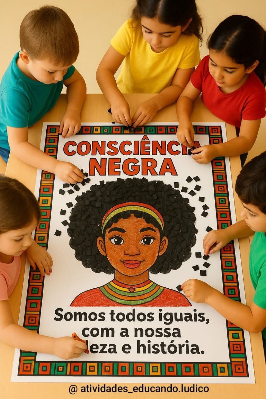 Cartaz Consciência Negra – Coletivo + Atividade individual folha A4* – 🖤 ✨ Tema: Consciência Negra – Atividade Coletiva para as crianças pintarem e colar papelzinhos no cabelo da moça negra. 📏 Tamanho: *1,05 x 1,49 m* (aprox.) 📄 Quantidade de folhas: *25 folhas A4* 💰 Valor: *R$ 6,00* 🖨️ Pronto para impressão em alta qualidade (PDF) 📚 Ideal para atividades coletivas na Educação Infantil e Ensino Fundamental. 💬 Frase: *“Somos todos iguais, com a nossa beleza e história.”*
