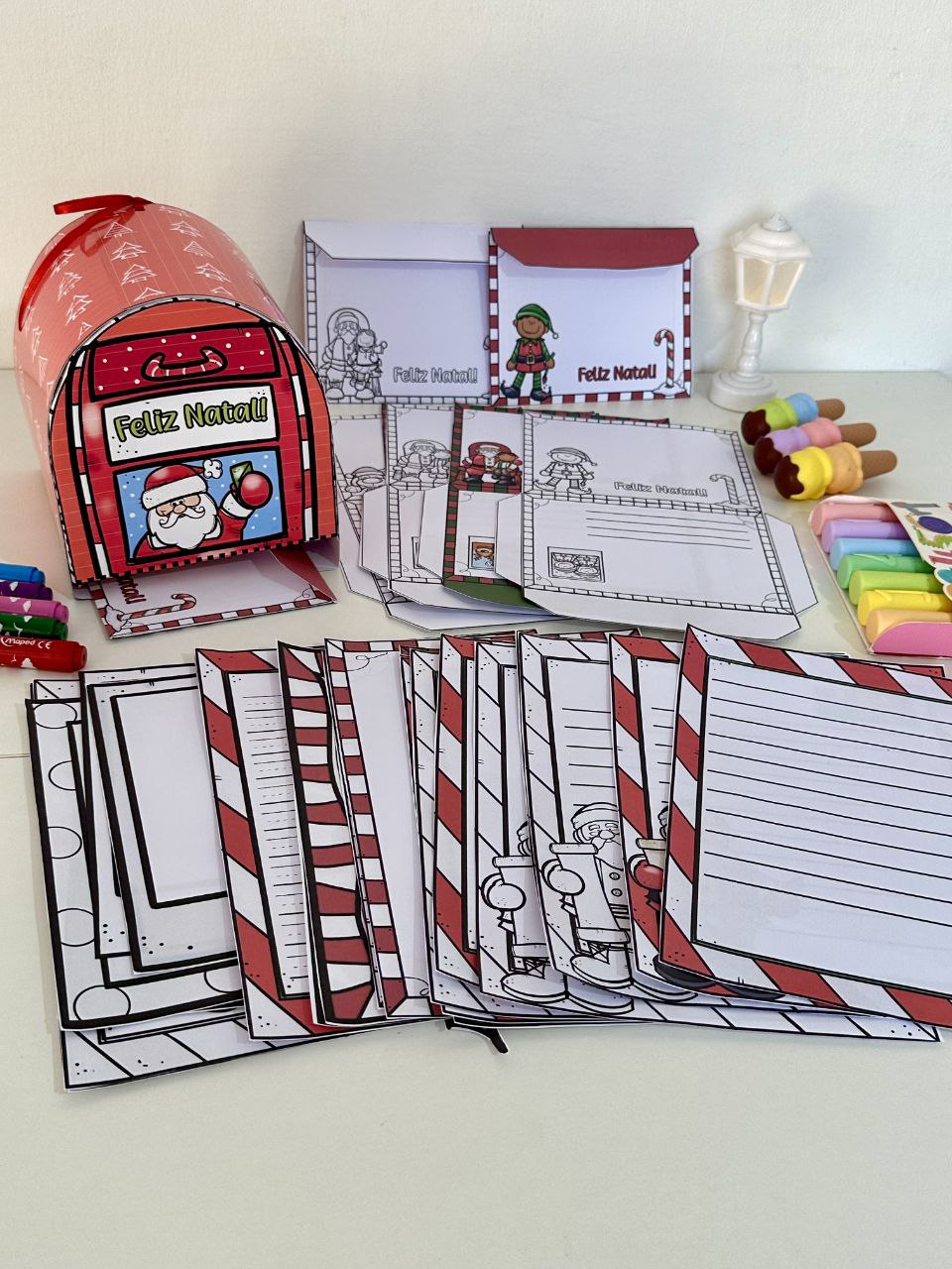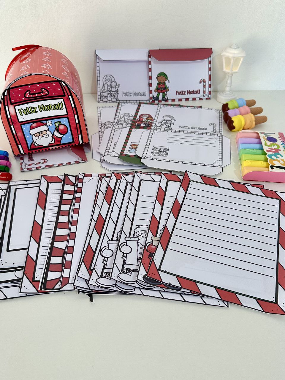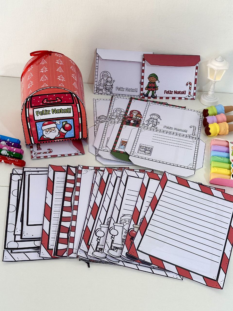 O material inclui opções de folhas para cartas, envelopes e também inclui uma caixinha em formato de Correio para cartas.