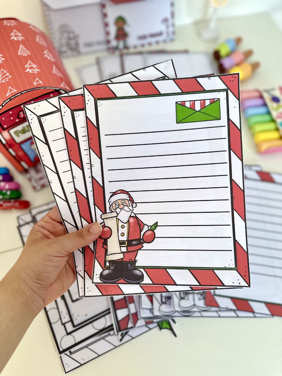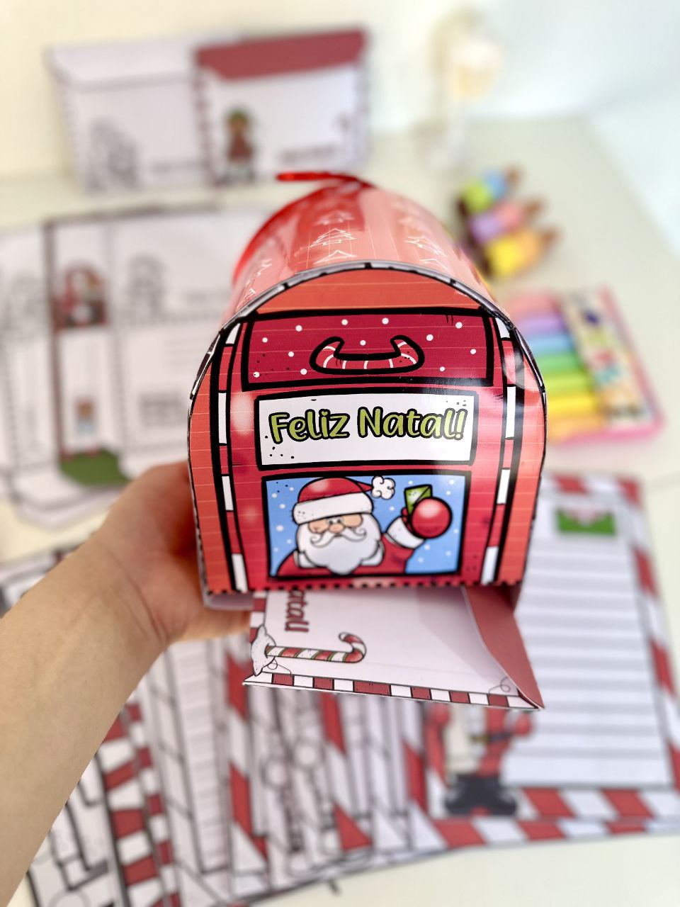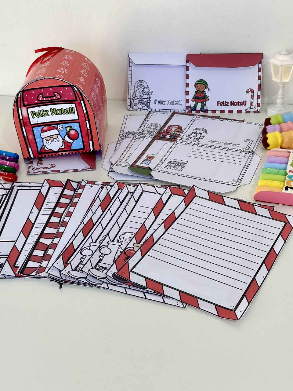 O material inclui opções de folhas para cartas, envelopes e também inclui uma caixinha em formato de Correio para cartas.