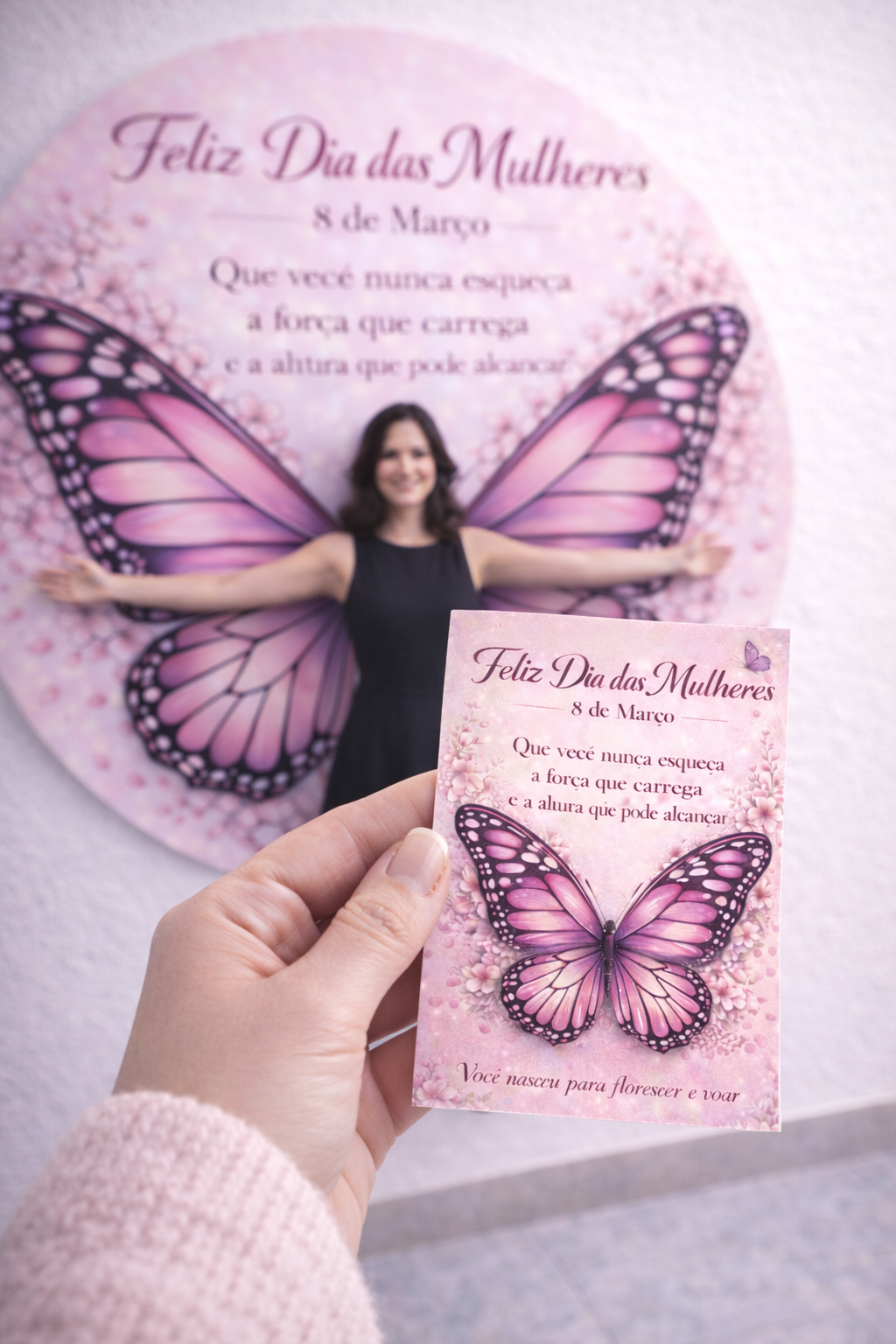 🌸 KIT DIA INTERNACIONAL DA MULHER – PAINEL + CARTÕES (ASAS DE BORBOLETA) 🌸