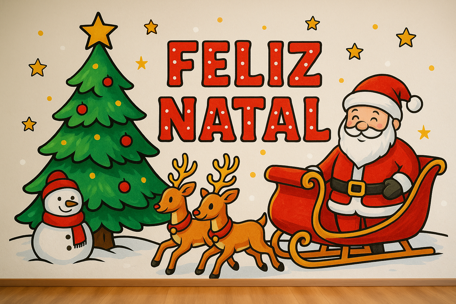 Painel super fofo, estilo cartoon, com Papai Noel, rena, árvore iluminada e vibe quentinha de Natal — perfeito pra escola, sala, loja ou festinha.