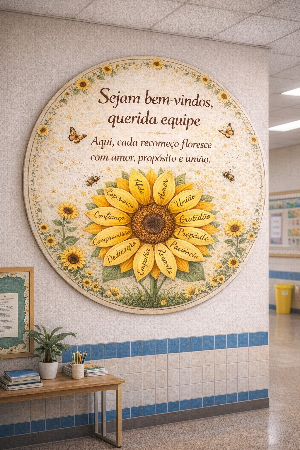 Ideal para recepcionar a querida equipe escolar, ele traz a mensagem de união, amor e propósito, com um delicado girassol representando valores essenciais como respeito, gratidão, empatia e compromisso 🌼✨