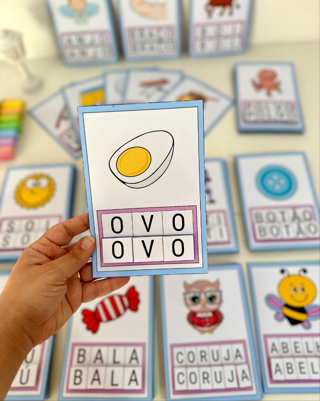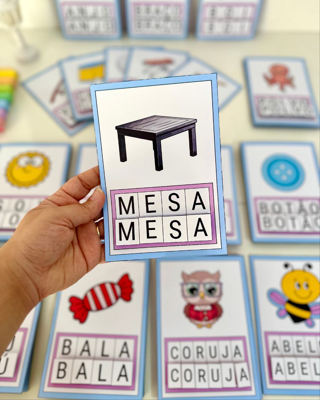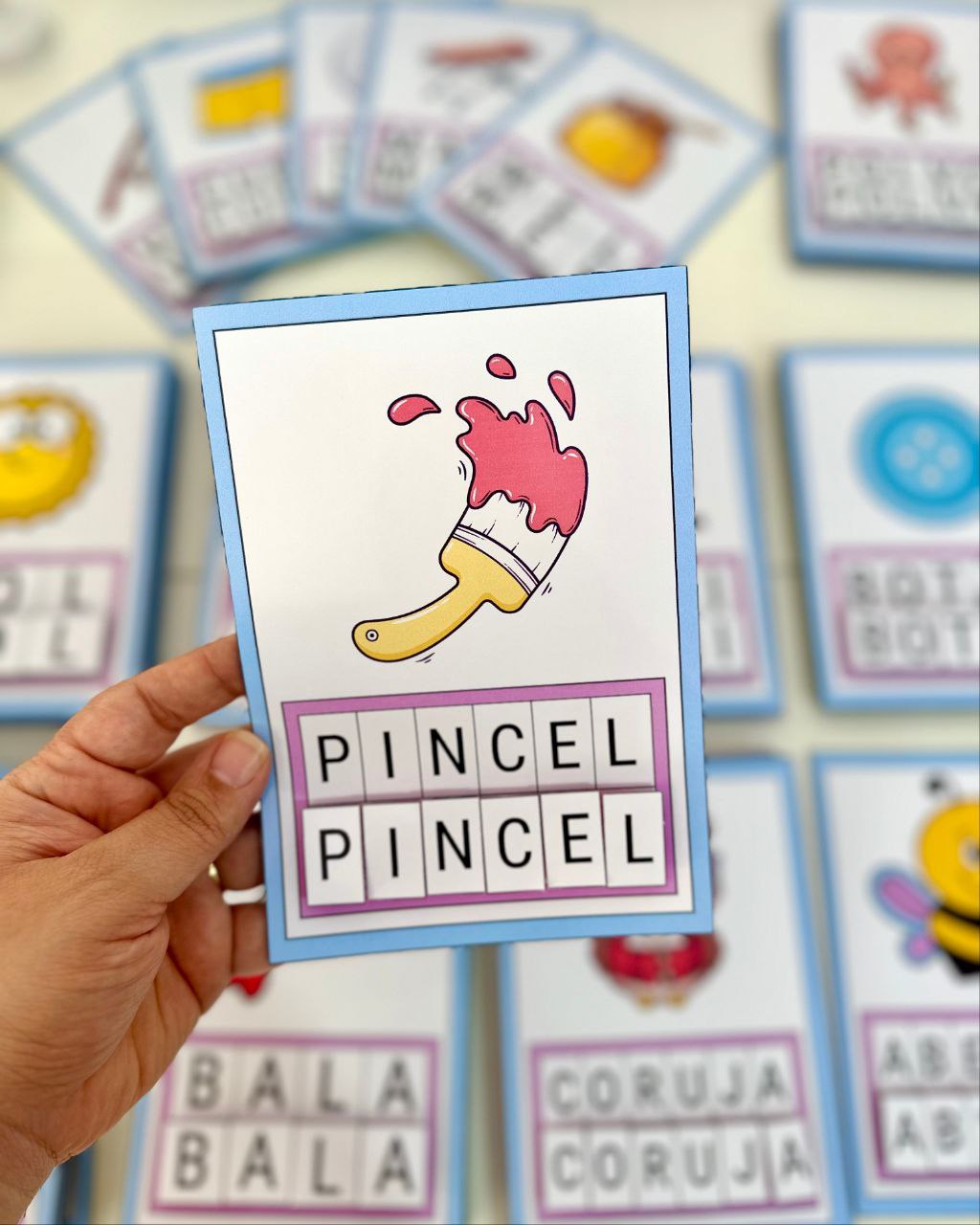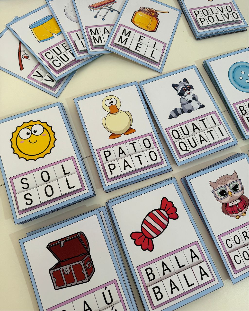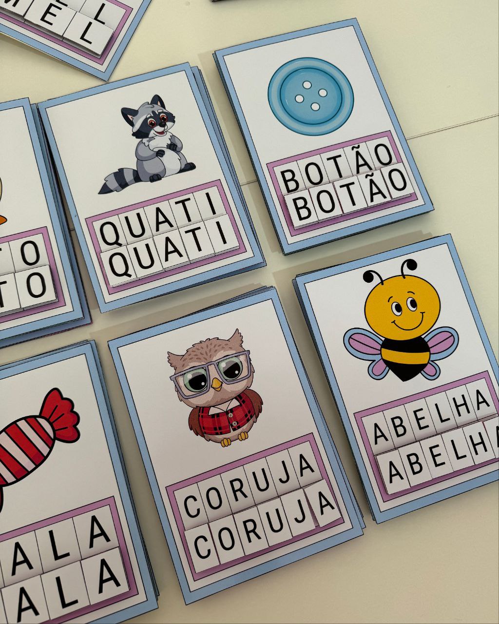 📄 O material é enviado em PDF pronto para impressão e inclui 44 fichas ilustradas com letras móveis, que permitem à criança organizar as letras e formar palavras e frases de acordo com as imagens apresentadas.