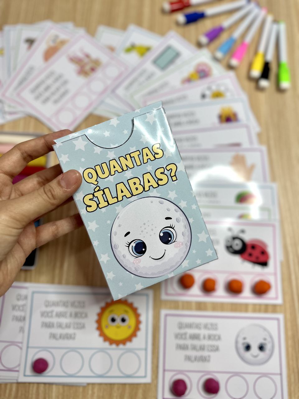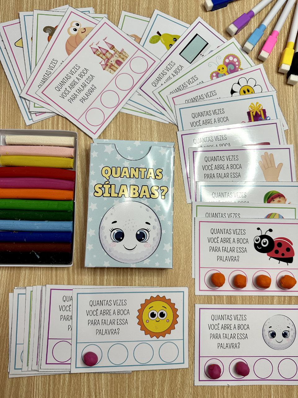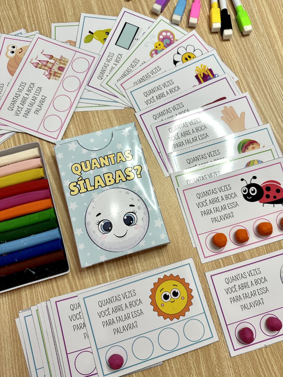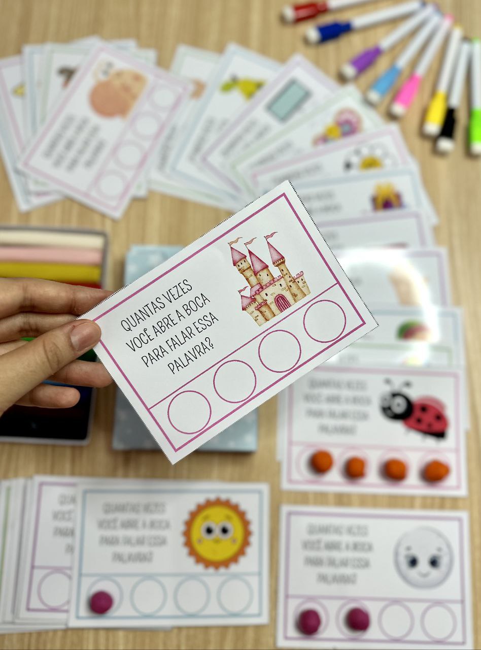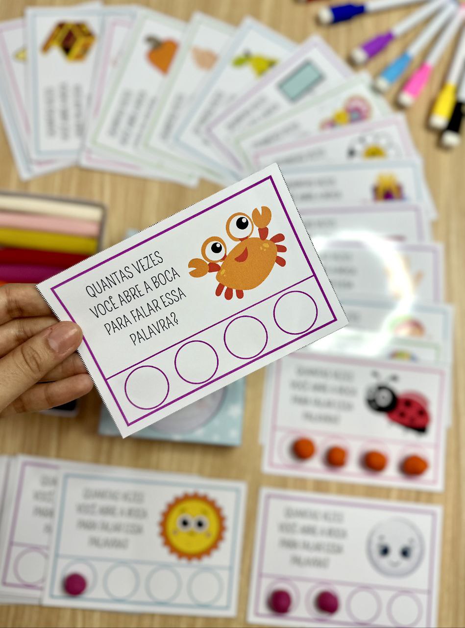 As 40 fichas trazem palavras diferentes, permitindo que as crianças identifiquem e contem o número de sílabas em cada uma delas.