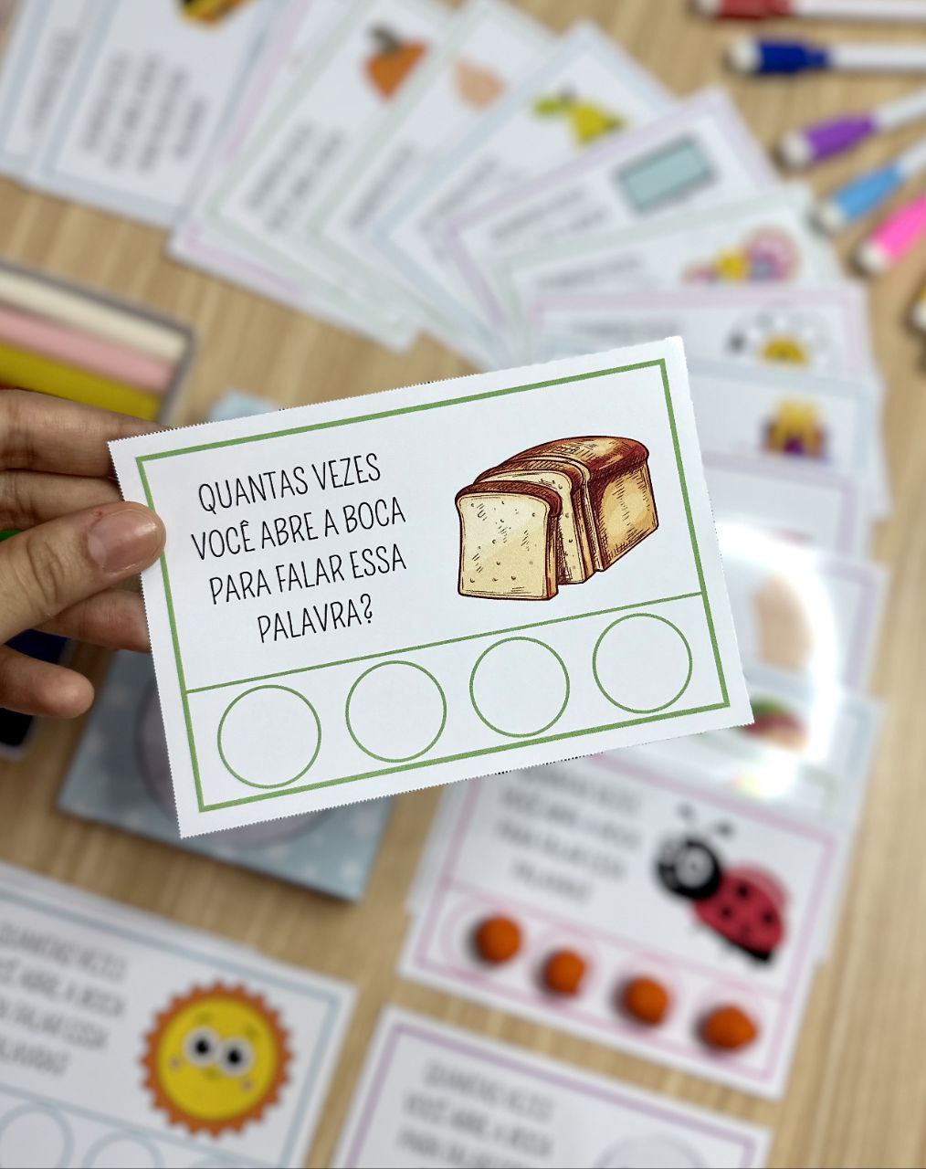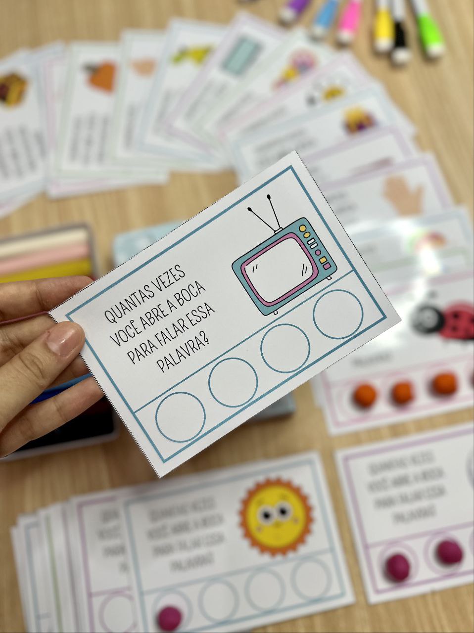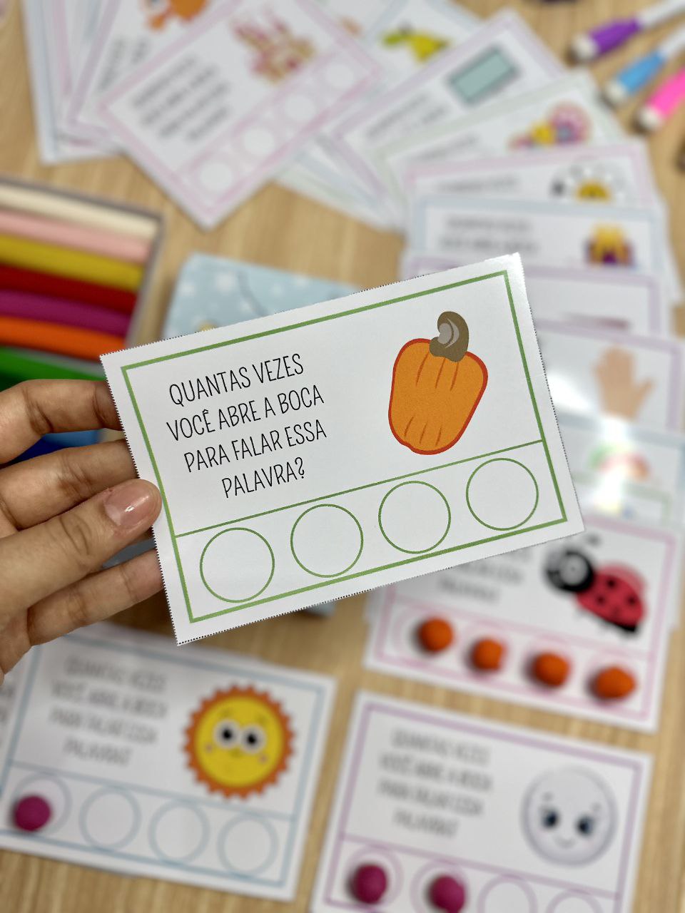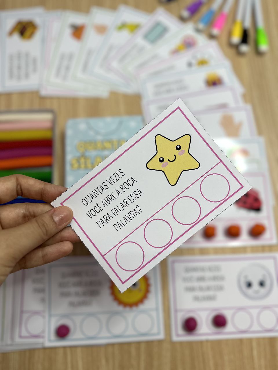 As 40 fichas trazem palavras diferentes, permitindo que as crianças identifiquem e contem o número de sílabas em cada uma delas.