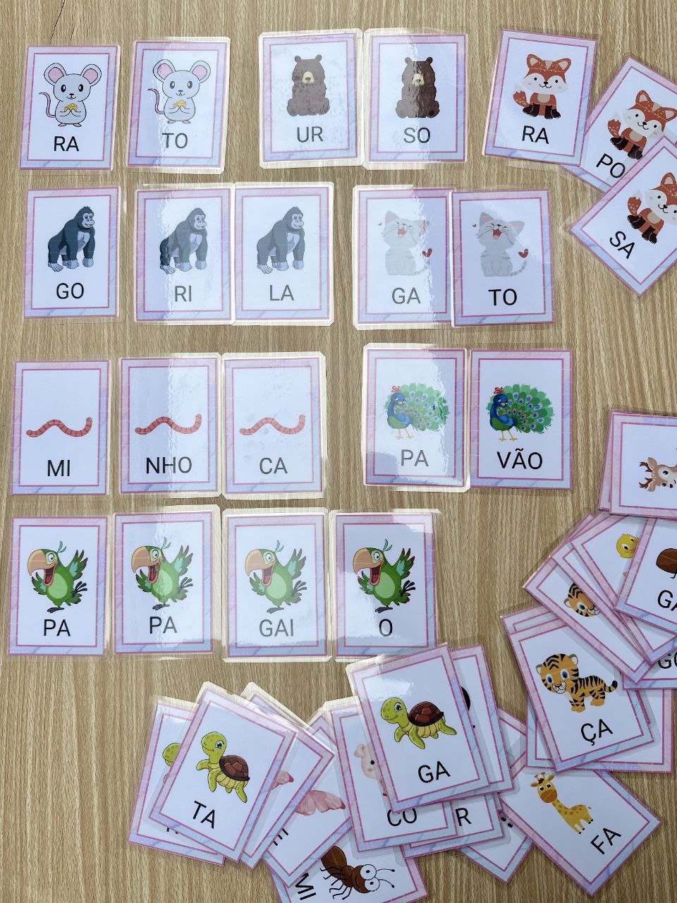 Nos cards aparece a imagem dapalavra correspondente, o que facilita o processo de formação de palavras para crianças no início do processo de alfabetização.